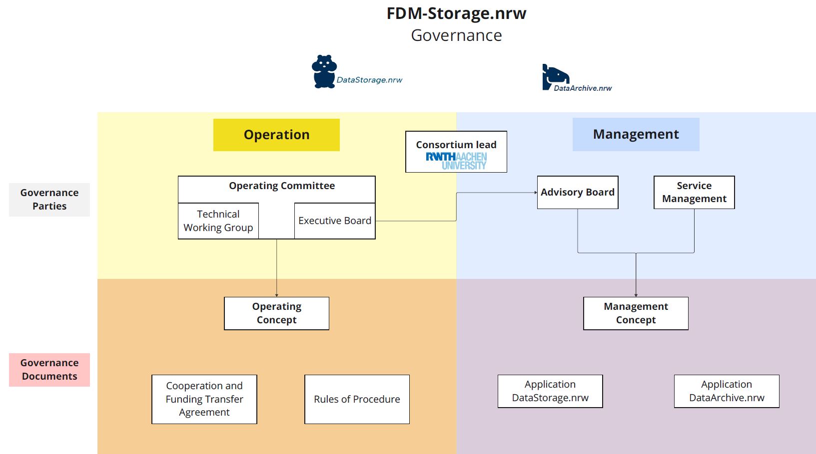 The governance of FDM-Storage.nrw is divided into two areas: operations and management.