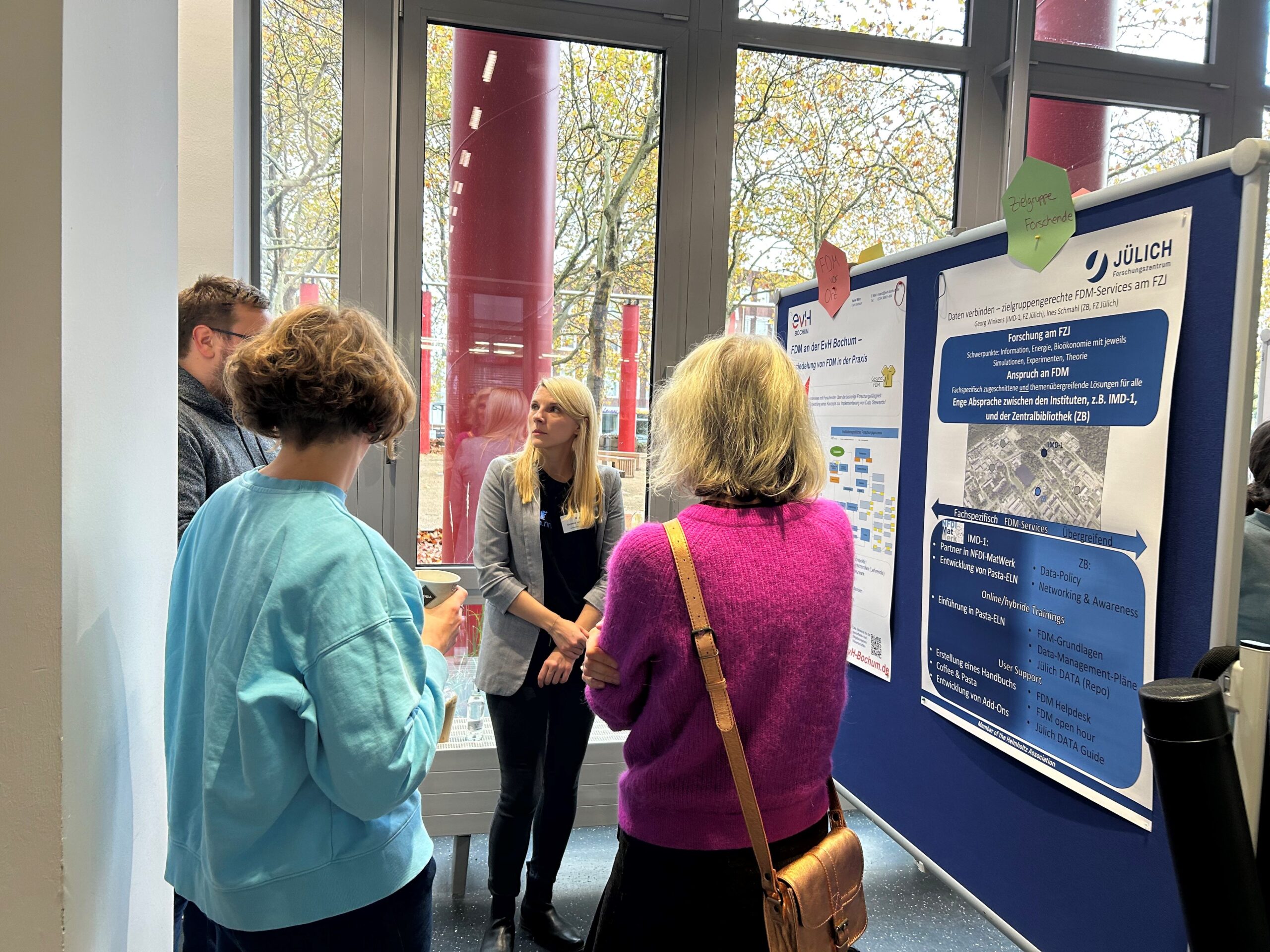 Am Nachmittag hatten die Teilnehmenden im Glaspavillon Gelegenheit, sich austauschen und voneinander zu lernen. Schon im Vorfeld waren sie eingeladen worden, das FDM an ihren Hochschulen und Institutionen in Posterform darzustellen. Die Poster waren dabei drei Tracks zugeordnet: