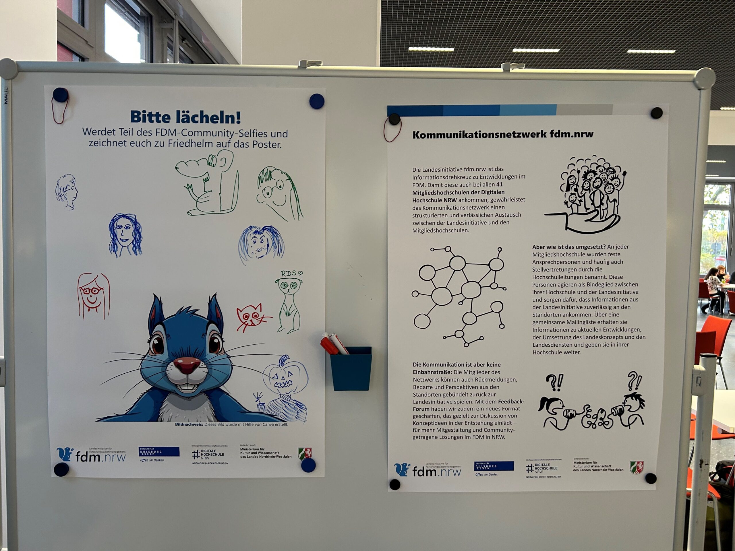 Auch beim ForschungsDating kamen die Forschungsdaten nicht zu kurz: in einem FDM-Community Speed Dating konnten die Teilnehmenden sich an sechs Thementischen austauschen. Am Tisch zur Weiterbildung wurde das Train-the-Trainer-Netzwerk, das seit 2023 die entsprechenden Workshops durchführt, vorbereitet und diskutiert. Der Tisch „FDM in Studium und Lehre“ befasste sich mit den Bausteinen eines möglichen FDM-Curriculums. Im Austausch zur FDM-Awareness haben Teilnehmende Maßnahmen, Herausforderungen und ihre Best-Practices geteilt. Technisch versierte Teilnehmende trafen am Thementisch „Tools und Technisches“ auf solche, die sich dem Thema gerade erst annähern. Im Austausch zu Evaluationen und der institutionellen Etablierung von FDM-Servicestellen wurde ein Stimmungsbild der Standorte mit Smilies auf die Papiertischdecke gemalt und anschließend Erfahrungen zum Vorgehen und der Kommunikation mit Forschenden und den Hochschulleitungen diskutiert. Auch ein Tisch zur NFDI durfte nicht fehlen: hier wurde berichtet, inwiefern die Arbeit der NFDI das FDM an den Standorten bereits beeinflusst.